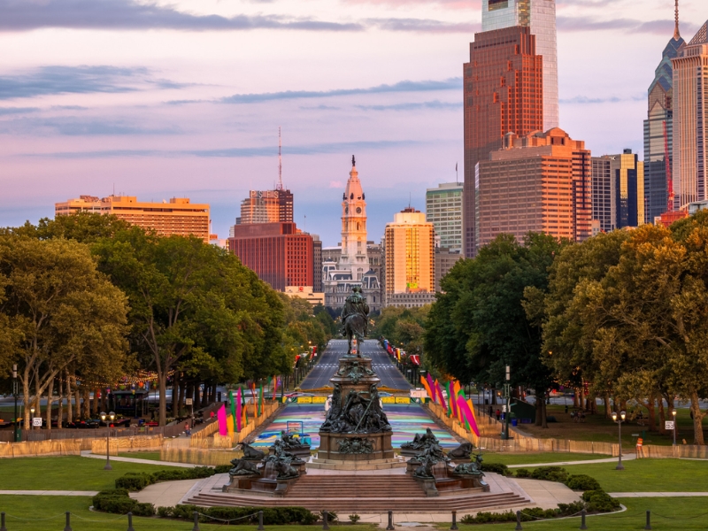 Buổi sáng: Quý khách dùng bữa sáng tại khách sạn và làm thủ tục trả phòng. Xe đón đoàn và khởi hành đi New York – trung tâm tài chính hàng đầu nước Mỹ và thế giới. Trên đường, đoàn dừng chân tại Philadelphia – cố đô của nước Mỹ, để tham quan những địa danh lịch sử nổi tiếng: